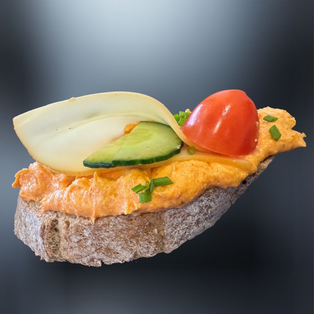 Na čerstvom chlebíku sa rozplýva lahodná bryndzová nátierka, doplnená údeným syrom, šťavnatou rajčinou a sviežou uhorkou, pažítkou, vytvárajúc tak dokonalú harmóniu chutí. 🥖🧀🥗🌶️