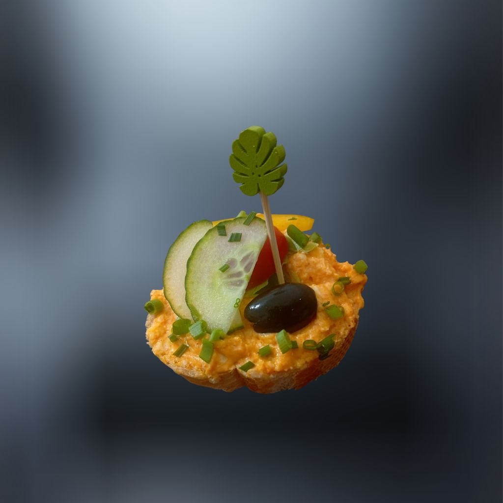 rožok, bryndzová nátierka, vajce, cibuľa, maslo, soľ, paprika, čierne korenie, jarná cibuľka, oliva, cherry rajčina