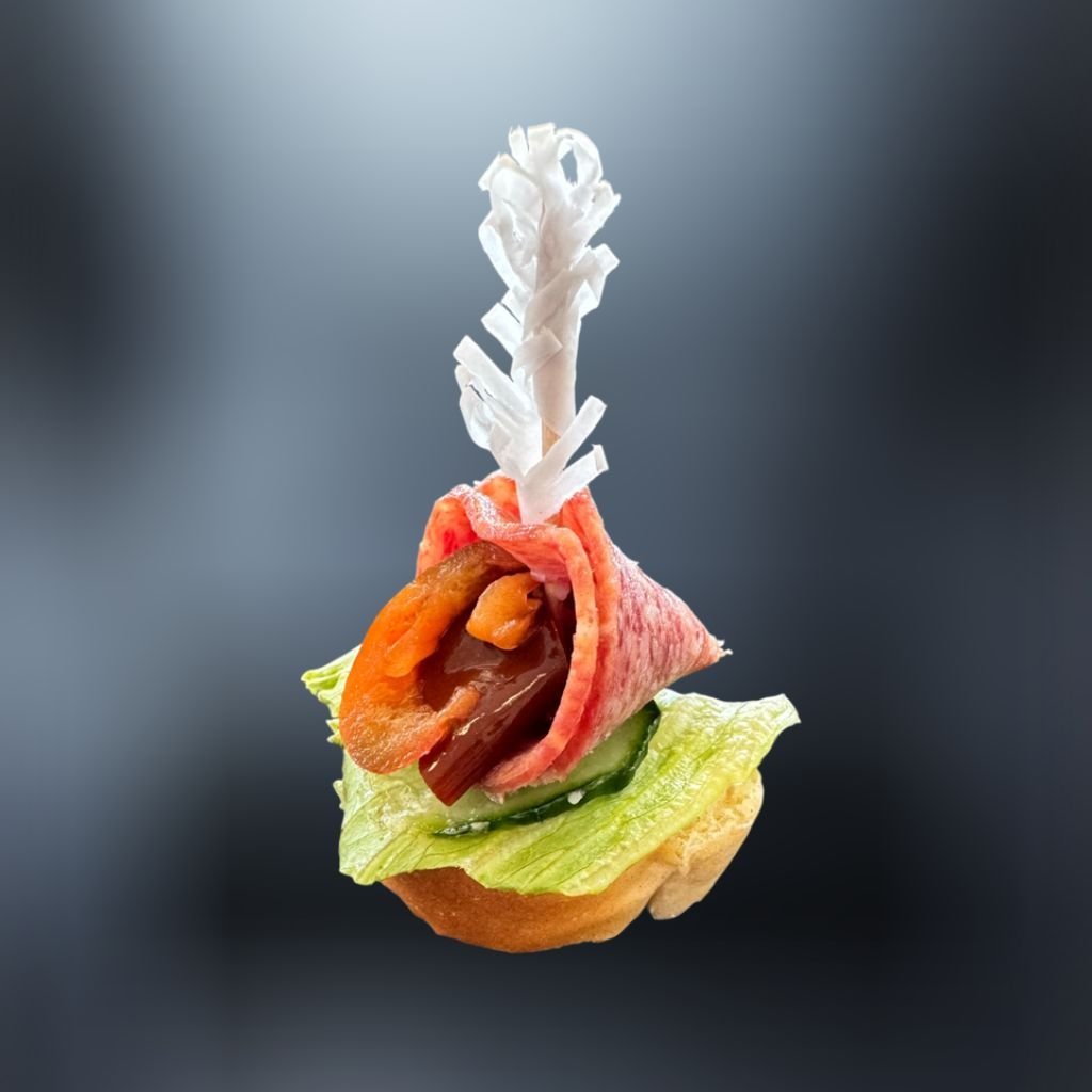 Na mäkkom rožku sa rozprestiera vrstva sviežeho šalátu (Lollo alebo ľadového), doplnená plátkami lahodnej salámy (Malokarpatská, Nitra, Paprikáš), vareným vajíčkom, šťavnatou rajčinou, chrumkavou uhorkou a jemnými klíčkami pre dokonalú harmóniu chutí. 🥖🥗🥚🌶️🍅