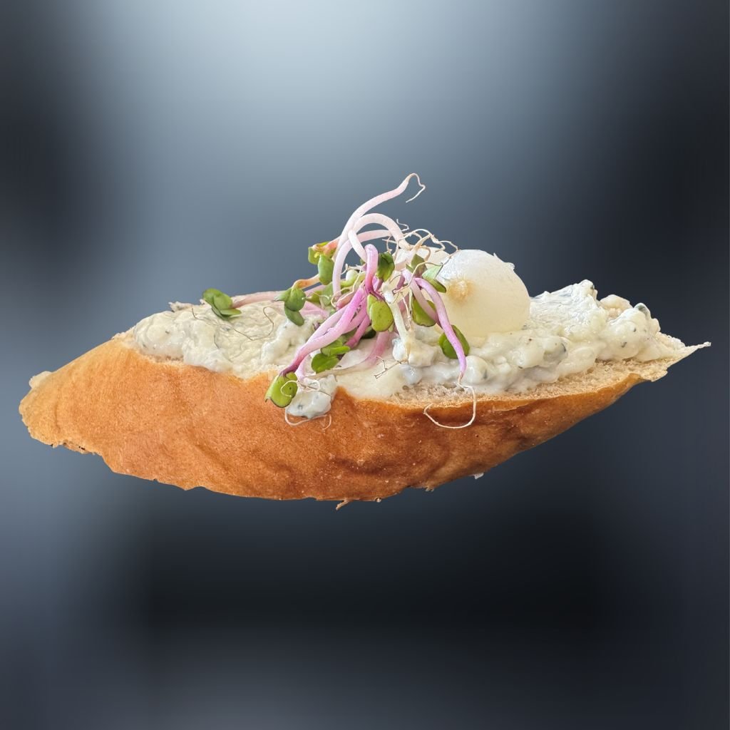 Kanapka je na chrumkavej bagete natretá lahodnou nivovou nátierkou, doplnená šťavnatou bielou cibuľkou, cesnakovými klíčkami a tým je dokonalou kombináciou chutí. 😊🥖🥗