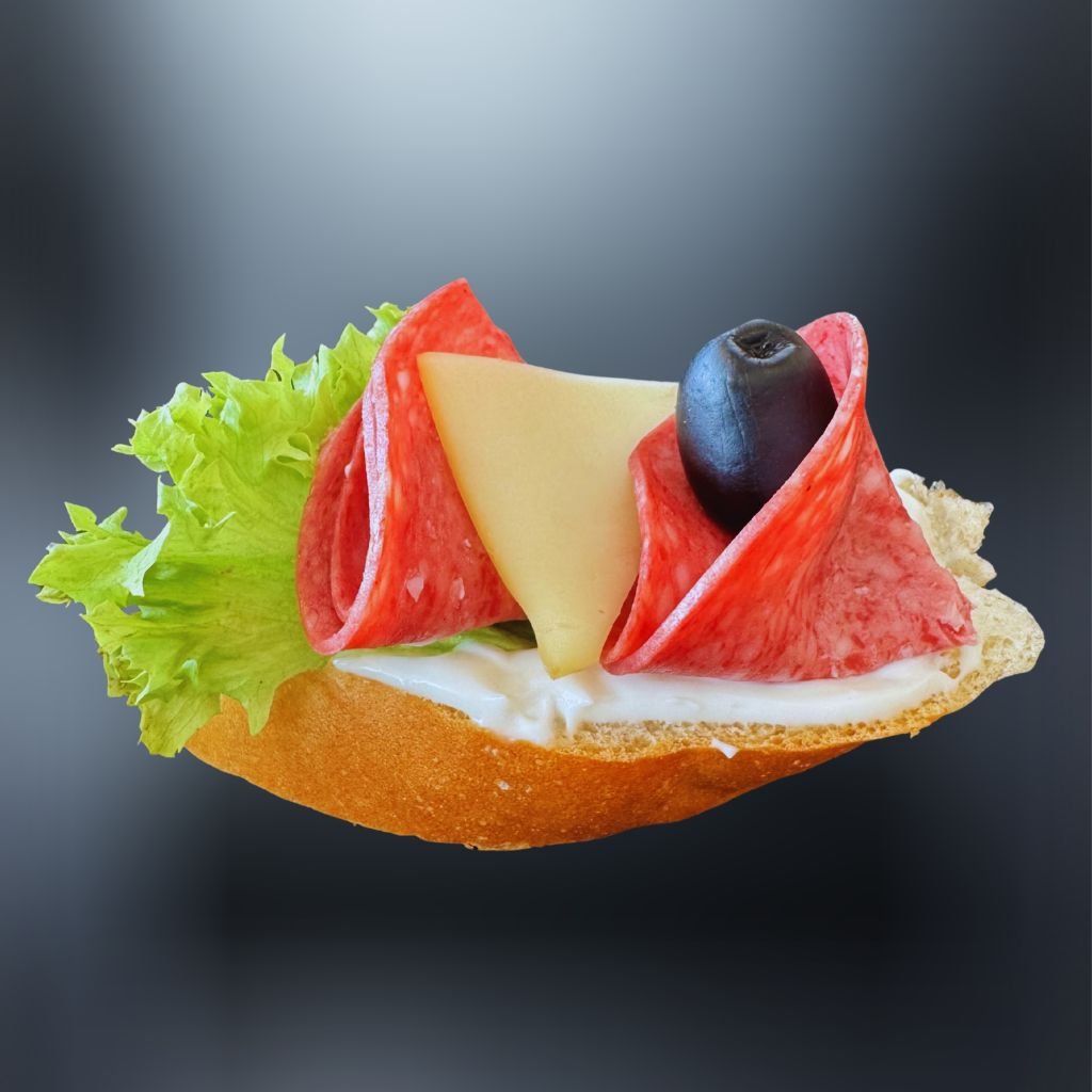 Na chrumkavej bagete s majonézou sa rozprestiera vrstva sviežeho šalátu (Lollo alebo ľadového), doplnená plátkami lahodnej salámy (Malokarpatská, Nitra, Paprikáš), údeným syrom a čiernou olivou na dokonalú harmóniu chutí. 🥖🥗🥚🌶️🍅