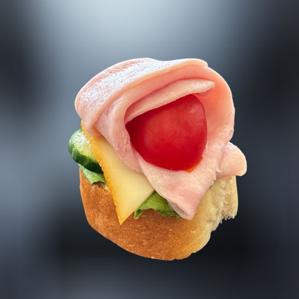 Na chrumkavej bagete sa vyníma lahodná šunková nátierka, doplnená sviežou uhorkou, šťavnatou rajčinou, chrumkavým šalátom lollo alebo ľadovým a korunovaná údenou syrovou guličkou. 🥖🧀🥗🍅🥒
