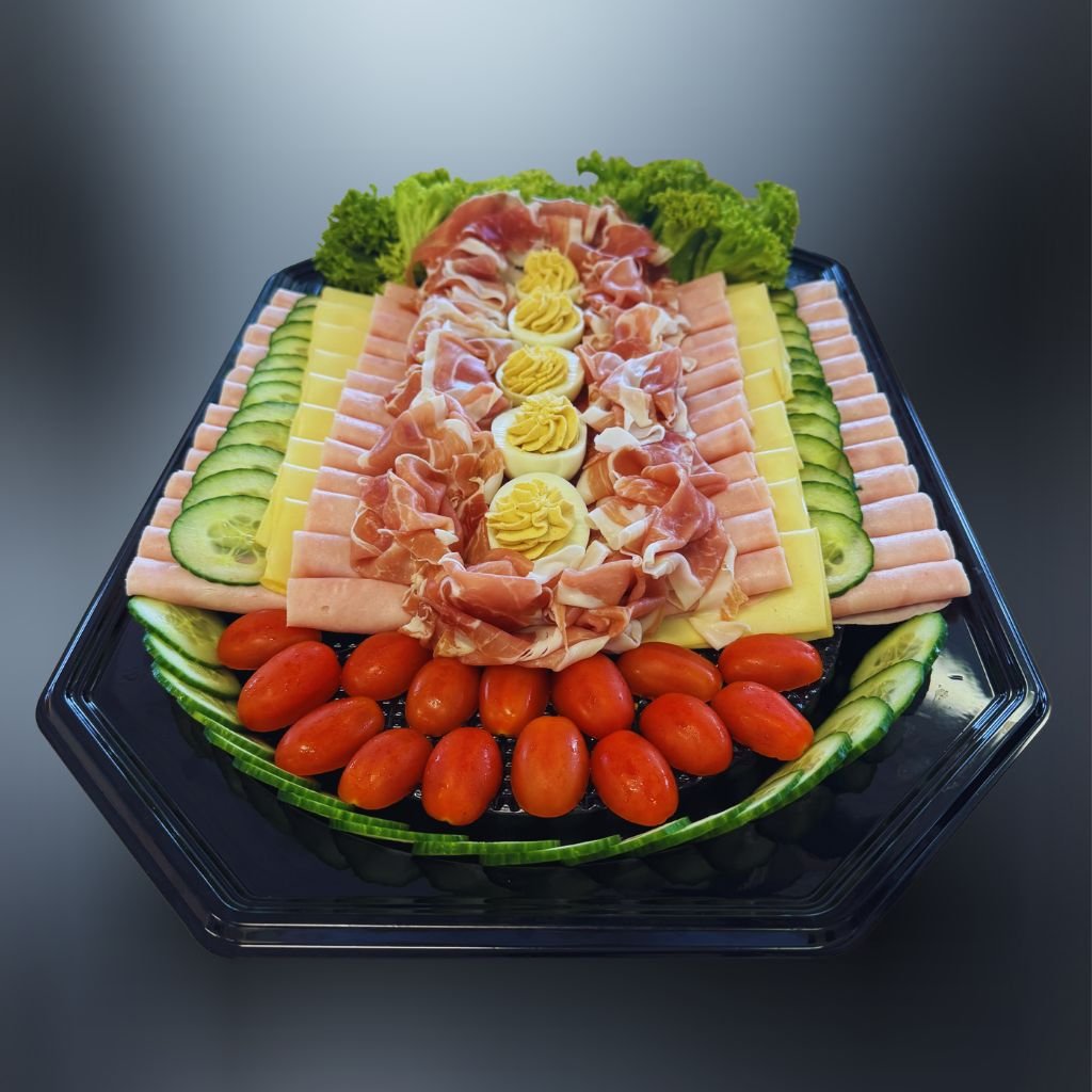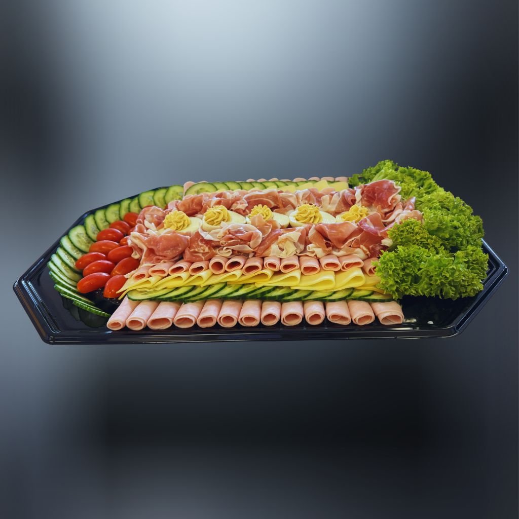 Luxusná obložená misa plná lahodných pochúťok za ktorú by sa nemusel hanbiť ani kráľ – jemná šunka, delikátne prosciutto, chutné vajcia, maslo, čerstvé cherry rajčiny, chrumkavé uhorky, údené plátky syra Eidam a svieži šalát Lollo, vytvárajú dokonalú kombináciu chutí pre každú príležitosť. 🥩🧀🍇🍅🥒🥚🥗🌶️