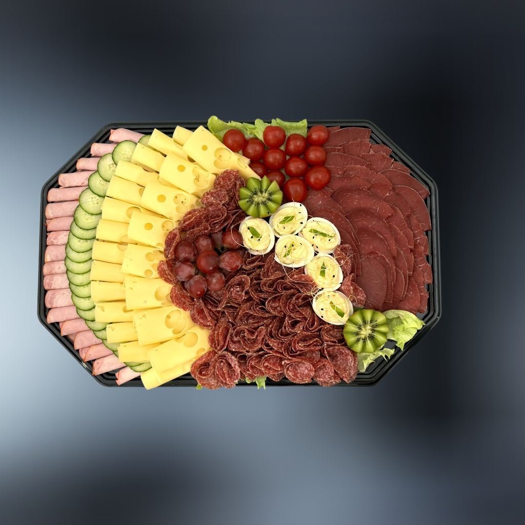 Luxusná obložená misa plná lahodných pochúťok za ktorú by sa nemusel hanbiť ani kráľ – jemná šunka, Malokarpatská saláma, delikátne prosciutto, chutné vajcia, maslo, čerstvé rajčiny, chrumkavé uhorky, údené plátky syra Eidam, osviežujúce hrozno, svieži šalát Lollo a šťavnatá paprika, vytvárajú dokonalú kombináciu chutí pre každú príležitosť. 🥩🧀🍇🍅🥒🥚🥗🌶️