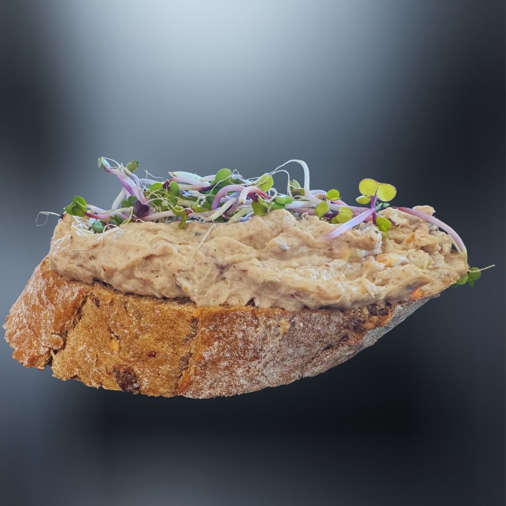 Na čerstvom chlebíku sa rozplýva lahodná rybacia nátierka, doplnená výhonkami cesnaku, vytvárajúc tak dokonalú harmóniu chutí. 🥖🧀🥗🌶️