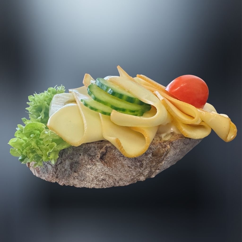 Na čerstvom chlebíku je základom lahodná Bánovecká nátierka, doplnená údeným plátkom syra Eidam a jemným Ementálom, chlebík je osviežený chrumkavou uhorkou, sladkou rajčinou, vareným vajíčkom a sviežim listovým šalátom pre dokonalý chuťový zážitok. 🥖🧀🥗🍇🥒🍅🥚