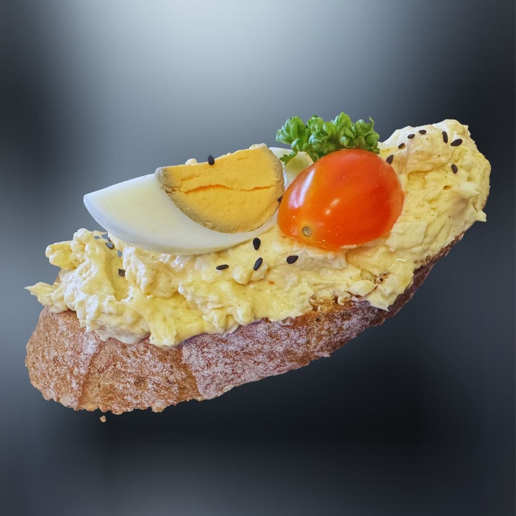 Na čerstvom chlebíku je základom lahodná vajíčková nátierka, doplnená uvareným plátkom vajíčka, chlebík je osviežený voňavou vňaťou a šťavnatou rajčinkou. 🥖🥗🥚